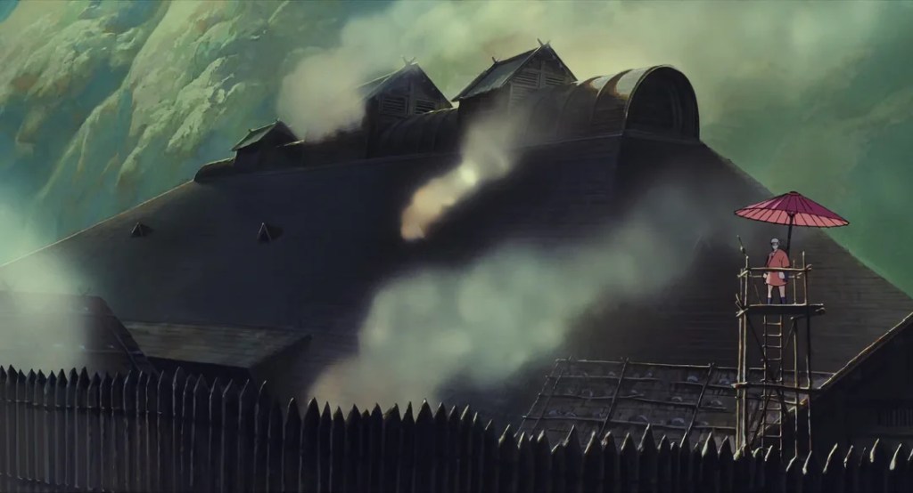 Women are at the center of this movie. They are treated as people with agency and how they use their agency to weave through the web of power propped up by a society heavily built on the idea of patriarchy. Matriarchs dominate this movie, a wolf mother and a mother wolf vie for power as one destroys the other’s home to protect her own. It is a tale as old as time, man vs. nature but Miyazaki focuses on the social contract between the forest and humans. When there is an equal exchange of goods between the two, they live in harmony. However, humans have crossed that barrier and have taken so much that the forest must fight back even if it means utter destruction and the forest’s anger is manifested in gungho boars who will fight to the last tusk, monkeys who have fallen out of the balance of nature (they have tasted human flesh), and the wolves who seem like the only creatures with any sense. Humanity in this film can be tender but also violent as Lady Eboshi rules Irontown with an… iron fist. She cares for lepers, sex workers, and the downtrodden and uses the forest to fan the flames of fire in her smelting works. Lady Eboshi tries to save her own people as she is simultaneously destroying their future as the trees fall, black smoke fills the air, and the forest gods become blinded by rage. We are dooming our own futures and what are we even doing to stop it? The self destructive nature of humanity and nature itself are constantly fighting each other for power, trying to dominate the other, but this domination has led us only to destruction. Are we not yet tired of tearing things down? Watching, jaded, as we diminish our futures with every tree that is felled, coral reefs bleached, and we forget the names of animals that we once knew… the beauty of this world is turned into a hellscape that nothing of value could survive in and we all play a role in this.